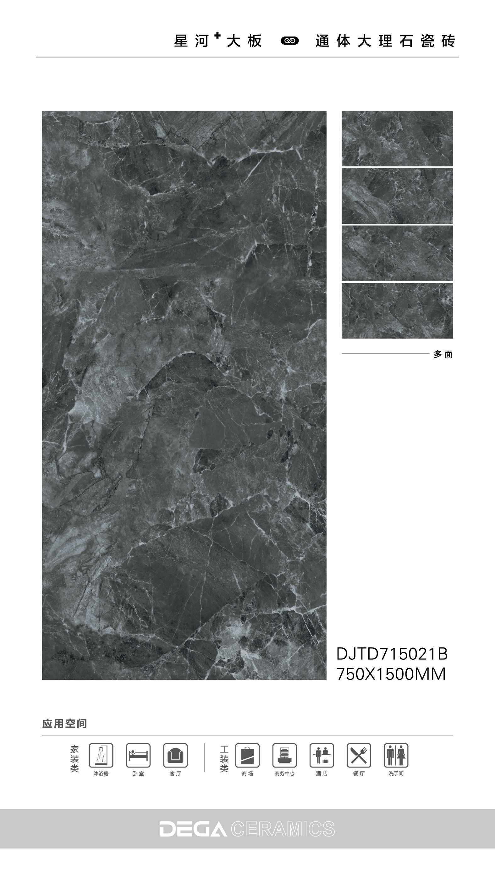 从规格形式的选择、纹理的趣味,到丰富内涵的表现、文化的传承等…… 都是她的每一侧面,在750X1500MM创造的舞台中央,是属于一片瓷砖传奇剧的演出。
